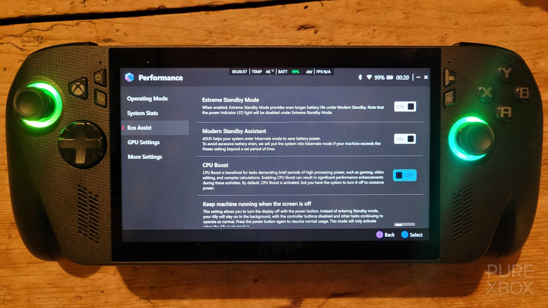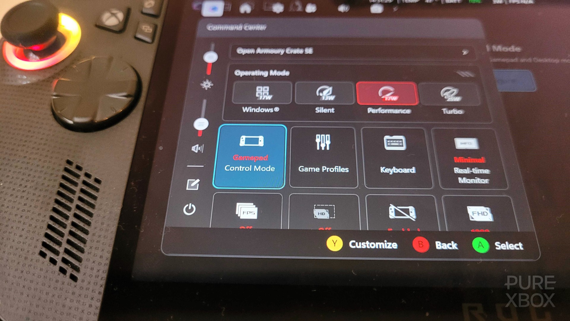 You've got three "operating modes" to choose from on the ROG Xbox Ally - "Silent", "Performance" and "Turbo". The higher you go, the more juice you'll be able to get out of your system, but the trade-off is a more rapid loss of battery life and fans that'll ramp up and get a little louder.