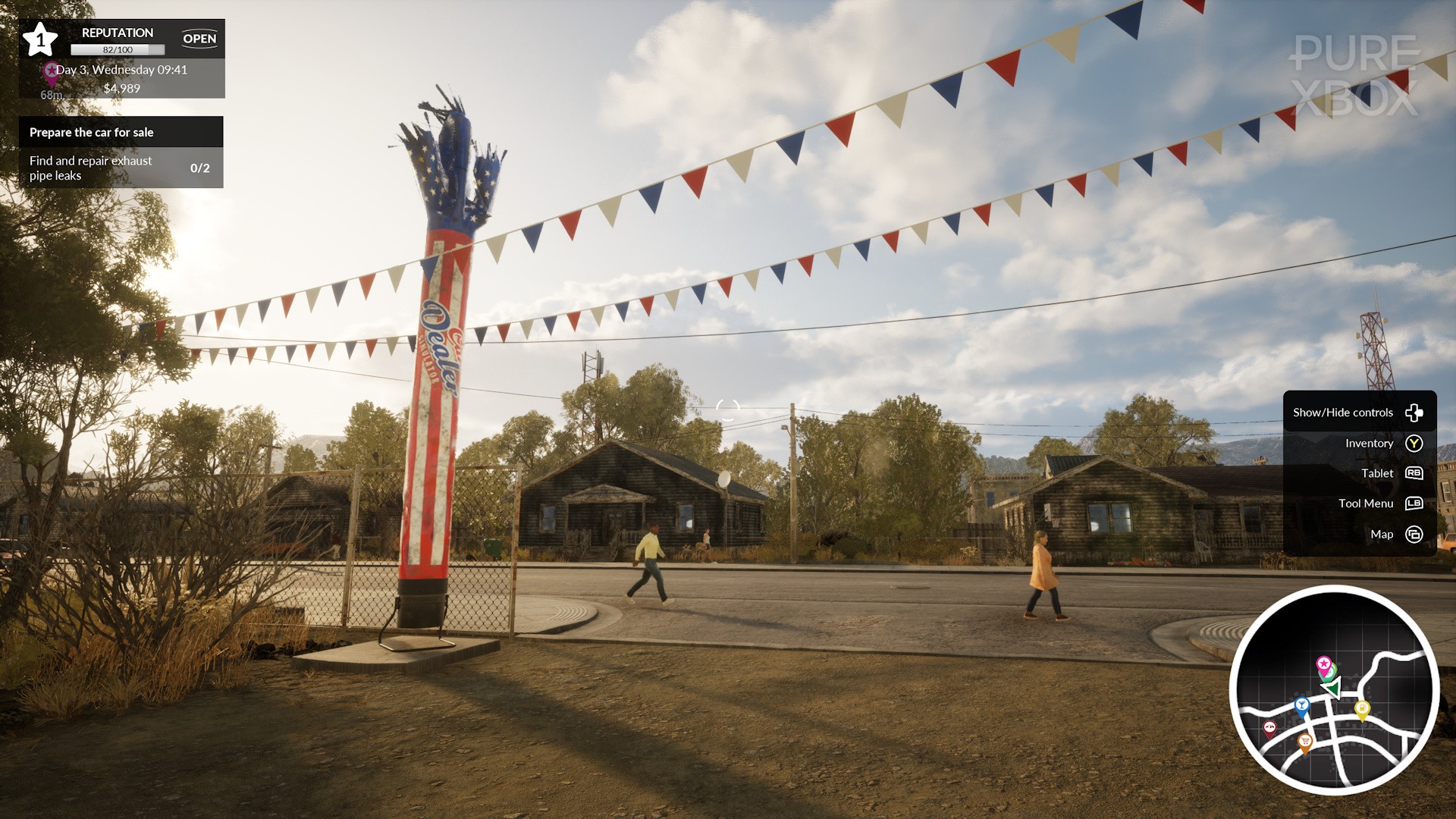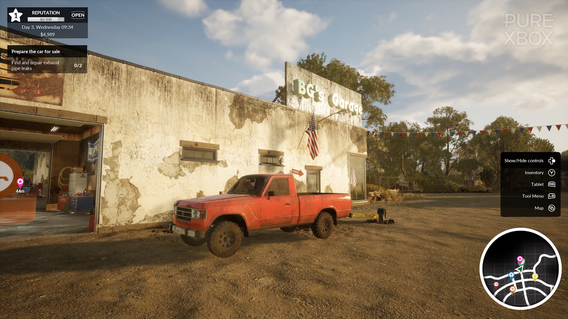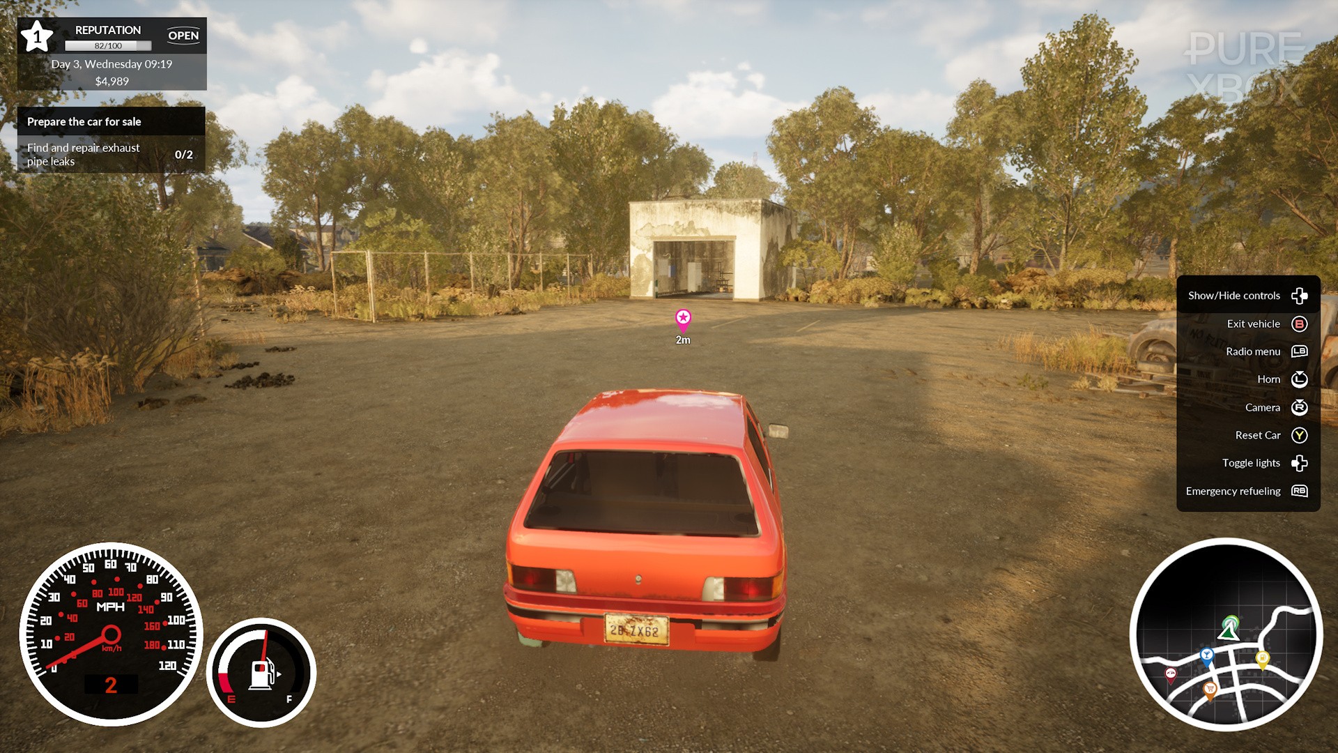 When I decided to download this sim to try it out, I was expecting lots of its systems to be digital, y'know? I thought I'd be sat in my office, scouring the classifieds for deals before sending cars off to cleaners and mechanics to turn a profit ASAP. However, so much of this is hands-on work here - you're driving around your local town, you're getting down and dirty with a hosepipe and you're fixing what needs to be fixed in your own little mechanic hub. It's all here and present in the game world, and I quite like how involved it all feels.