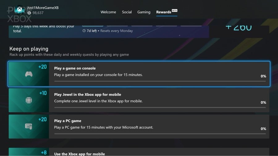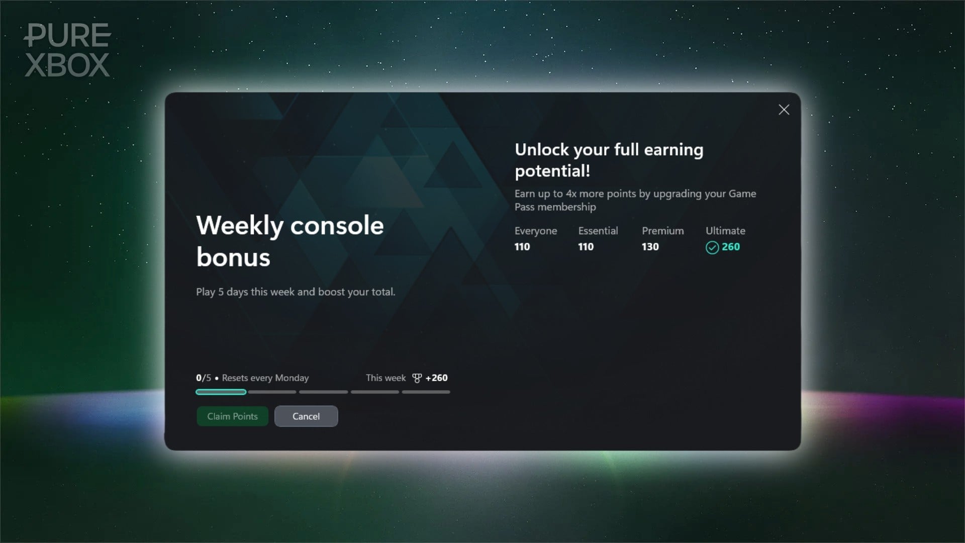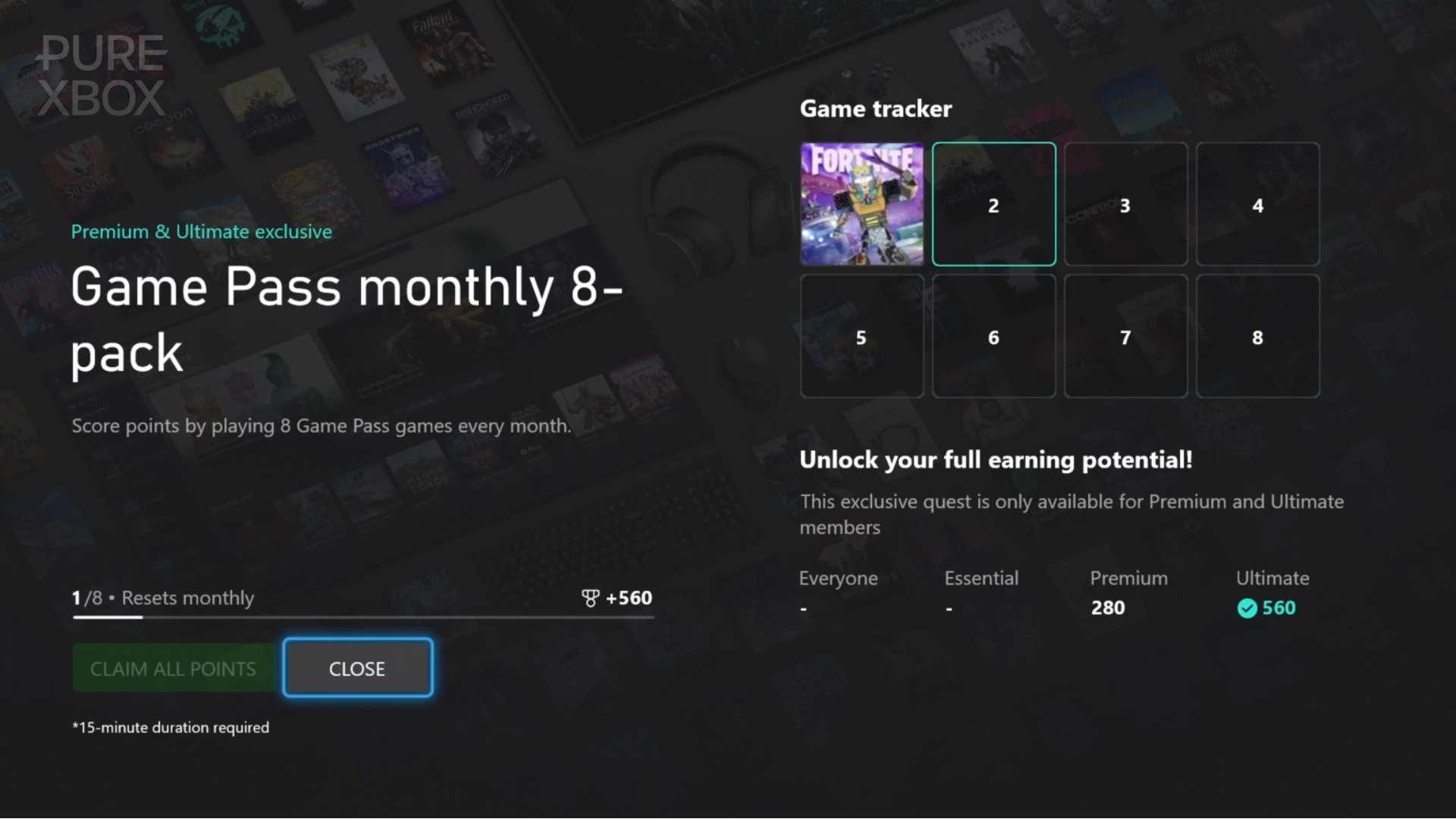 If you play any game from the Xbox Game Pass Premium or Ultimate library for at least 15 minutes, you'll earn 10-20 points for that day depending on which tier you're subscribed to. Obviously that's not a huge amount, but it gives you around 600 points if you do it all month — better than nothing!