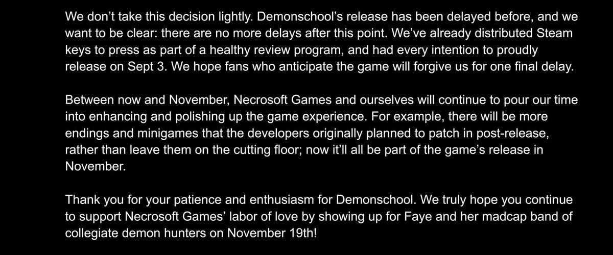 And then, the developer (Necrosoft Games) issued a separate statement, clearly indicating frustration at having to move their game back by a couple of months.