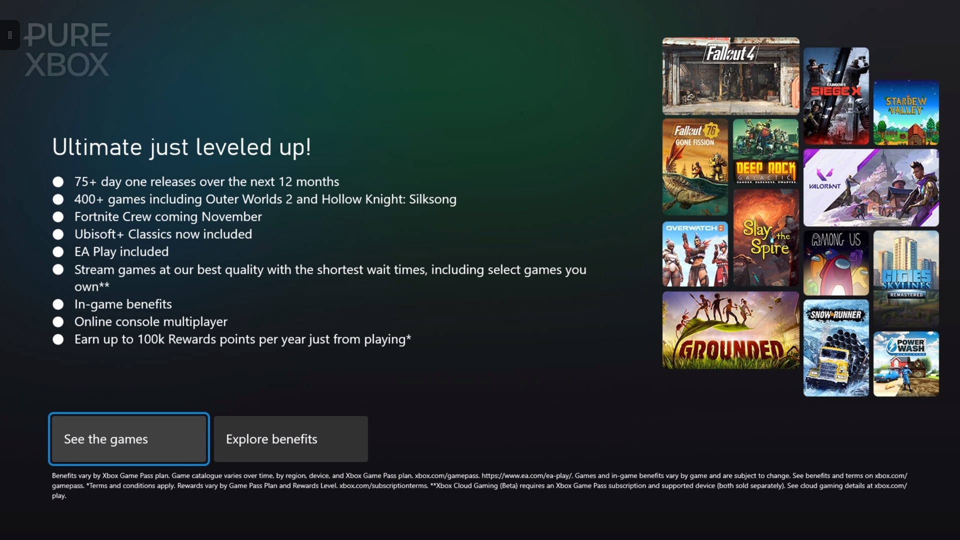 We haven't seen this ad on our systems just yet, but we are seeing a very similar overview on the Microsoft Store on console. Our ad doesn't mention that November date for existing subs; it simply lists all of Game Pass Ultimate's new features as bullet points. We'll throw an example of what we're seeing down below: