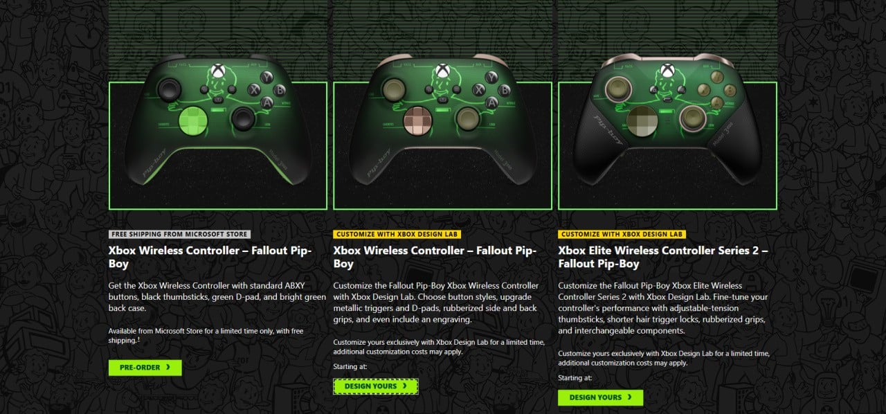 The Xbox Wireless Controller – Fallout Pip-Boy is available for pre order, for a limited time, at Microsoft Store. For those looking to create their own unique design, both Xbox Wireless Controller and Xbox Elite Wireless Controller Series 2 are available now with Xbox Design Lab.