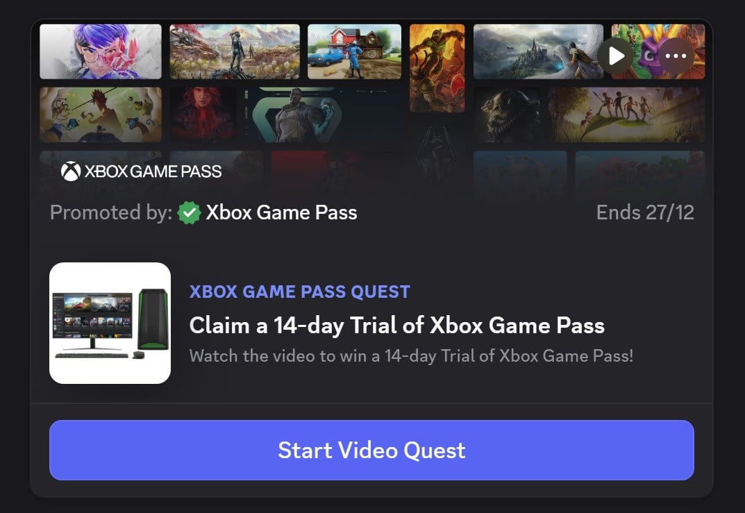 If you log into your Discord account (you'll need one already - it doesn't seem to work with new signups), you'll need to look for the "Quests" section on the dashboard. There's all kinds of stuff in here, but if you scroll down far enough, you'll hopefully come across an offer that says "Xbox Game Pass Quest".