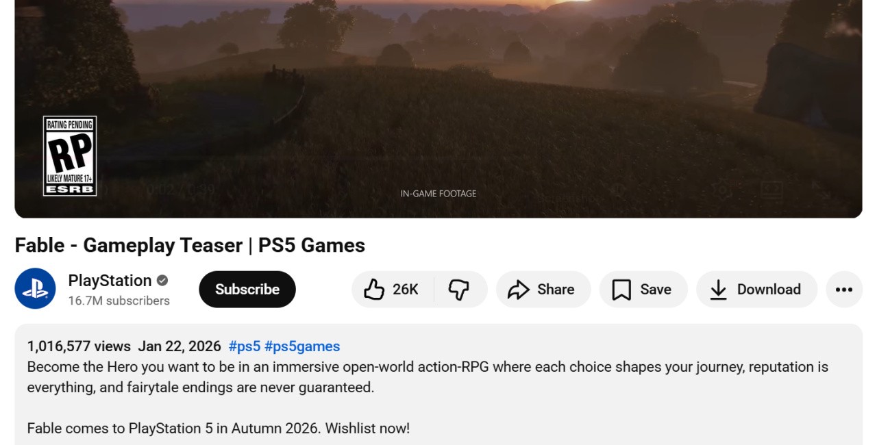 In the wake of Fable showing up at Xbox Developer Direct, PlayStation uploaded the title's new gameplay teaser to its YouTube channel. This was the first slice of the Fable reboot shared directly by the PS5 maker, and it's racked up one million views in just a few days.