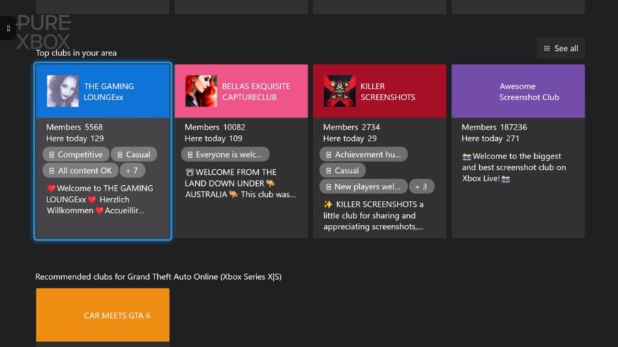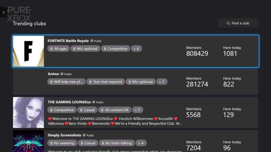 If you don't recall what Social Clubs are, we don't blame you to be honest! They're quite a hidden feature on Xbox consoles these days, but you can find them by going to the Friends & Community Updates app and then navigating to "Clubs on Xbox", where you'll find all kinds of user-created clubs for discussion, screenshots, artwork and various other things. There are also clubs related to websites, clubs related to specific games, and more.