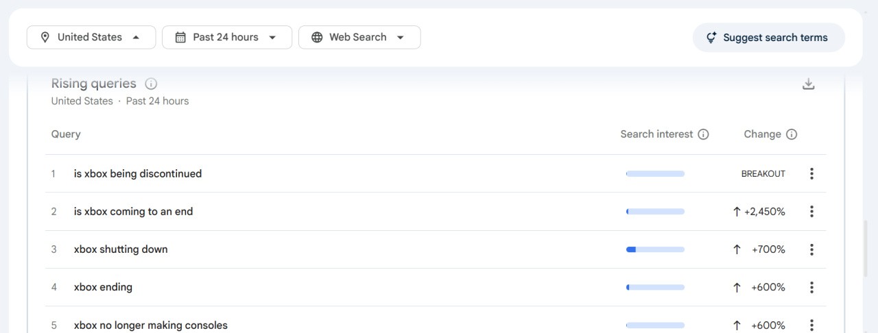 This very quickly sparked a huge number of news articles and social media posts, and these clearly had a big effect — even as recently as yesterday, Google was hit with plenty of searches about whether Xbox was either "coming to an end", "being discontinued", "shutting down", "ending", and various other forms of this question.