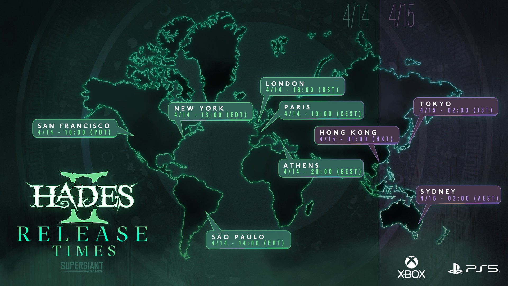 We've known for a while now that Hades 2 has a release date of April 14th, and now we know the specific times that we can go hands-on with it. Here's the launch time map, straight from the team: