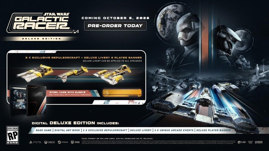The Deluxe Edition of Star Wars: Galactic Racer comes with three bonus vehicles – the Kor Sarun: Darc X landspeeder, Kor Sarun: Ciza T speeder bike, and Kor Sarun: Rak S skim speeder – alongside three deluxe Arcade events designed to test your skills with these powerful repulsorcraft, as well as the Deluxe Livery Pack with unique designs for all of your vehicles. In addition, pilots will have access to the Deluxe Player Banner Pack, with a new Insignia and Background for you to show your style in multiplayer modes, and a Digital Art Book containing never-before-seen artwork of the characters, locations, and vehicles of Star Wars: Galactic Racer. The Deluxe Edition is available at an SRP of $79.99/£64.99/€79.99. A Deluxe Edition Upgrade will be made available at launch.