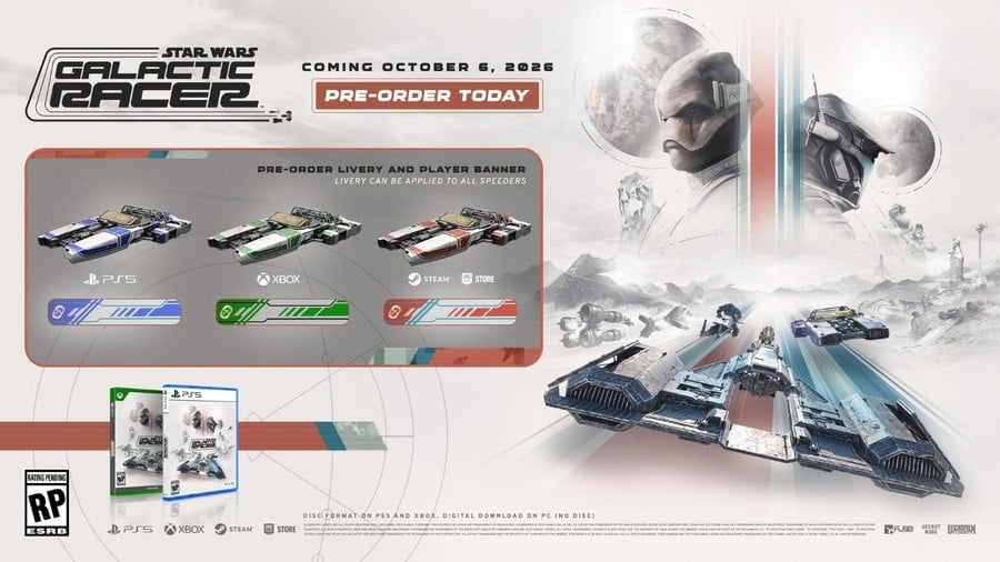 All pre-orders of Star Wars: Galactic Racer will include a free bonus livery which can be used with your landspeeders, speeder bikes, or skim speeders, with a unique color for the livery depending on your pre-order platform. Additionally, all pre-orders will come with a free Player Banner background for use in multiplayer modes.