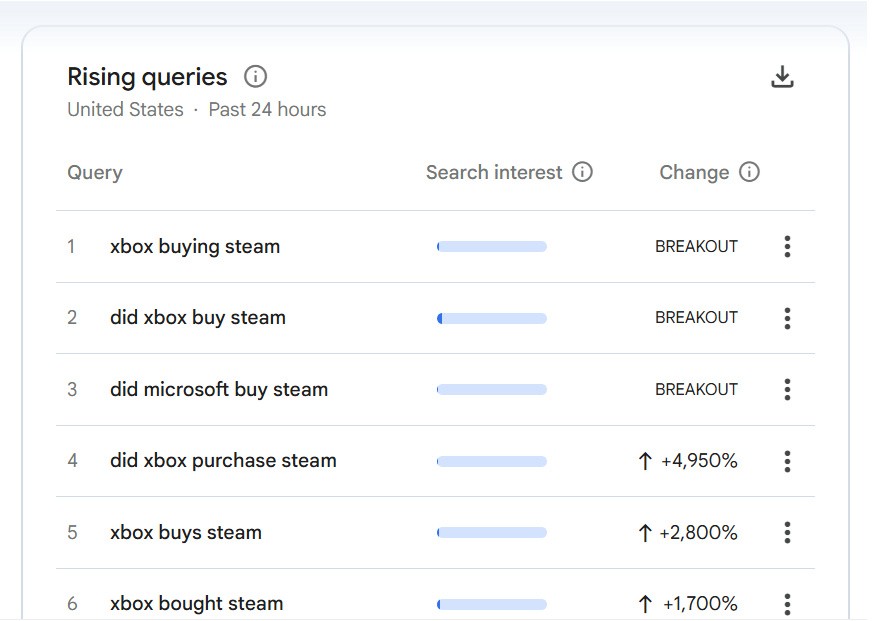 Going through the daily Google Trends is something that's part of our job here at Pure Xbox — we always want to keep on top of which Xbox-related searches are getting the most attention — and it took us by surprise yesterday when all of the top rising queries for Xbox involved searches like "Xbox buys Steam", "did Xbox buy Steam", "did Xbox purchase Steam" and "Xbox buying Steam".
