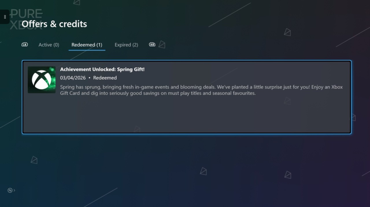 As you can see from the image above, it seems the "Spring Gift" was actually issued at the start of the month (at least in my case), but it's been hidden away in the Offers & Credits section until now. It was only last night that Xbox officially started messaging people to let them know about their free Xbox Gift Card.