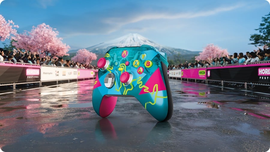 "The Xbox Wireless Controller – Limited Edition Forza Horizon 6 is one of the most vibrant controllers Xbox has ever released. With a transparent cyan blue top case easing into a metallic gradient, it is accentuated with volt green, hot pink, and silver. The pops of color are further emphasized by a silver metallic DPad and two-tone rubberized diamond grips. The core design inspiration emerged from the Touge roads of Japan."